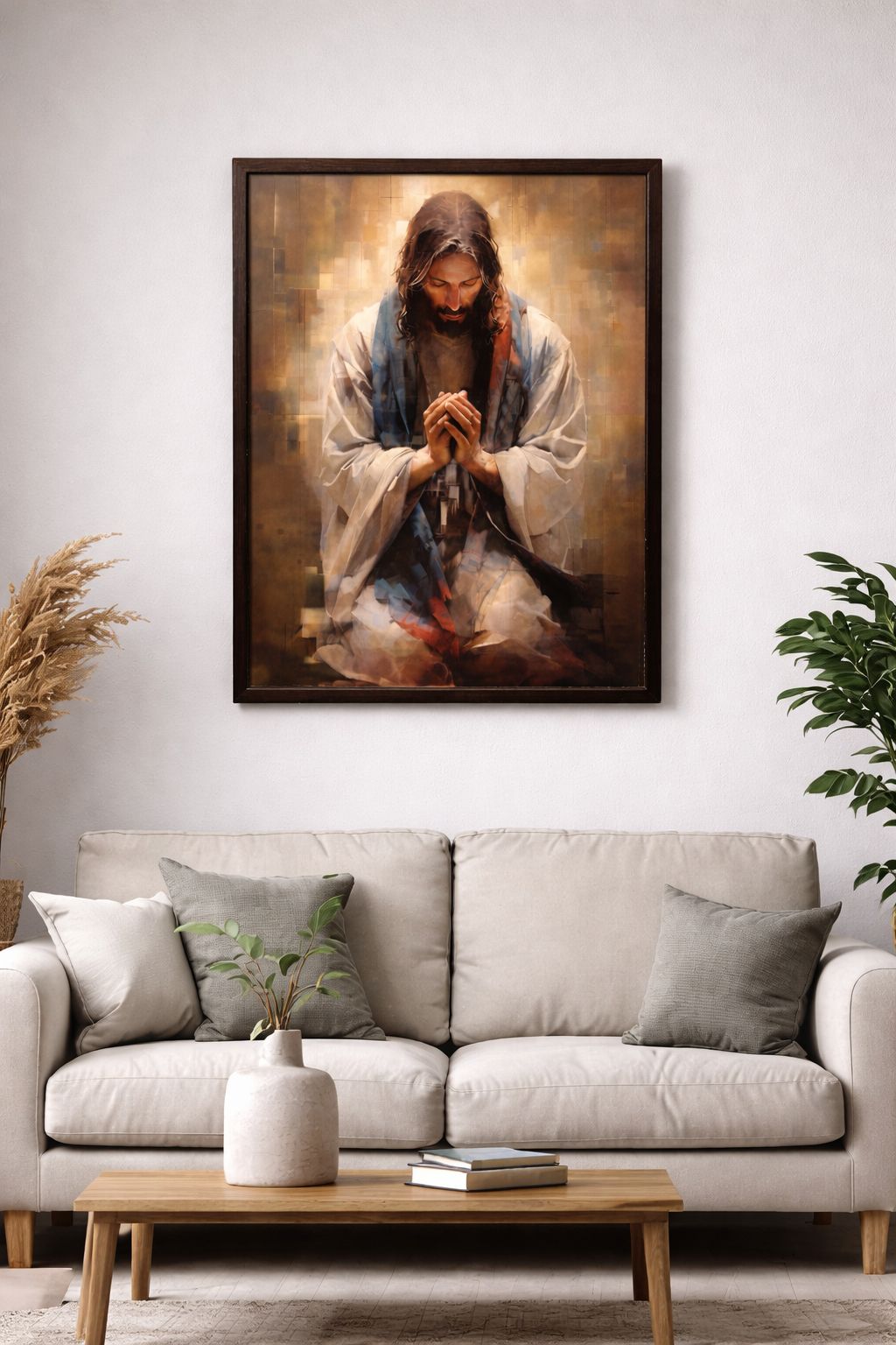 Quadro decorativo com a imagem de Jesus Cristo em oração, representando um momento de fé, paz e espiritualidade. A arte possui tons quentes e iluminação suave que destacam a serenidade da cena, trazendo um significado profundo para o ambiente.