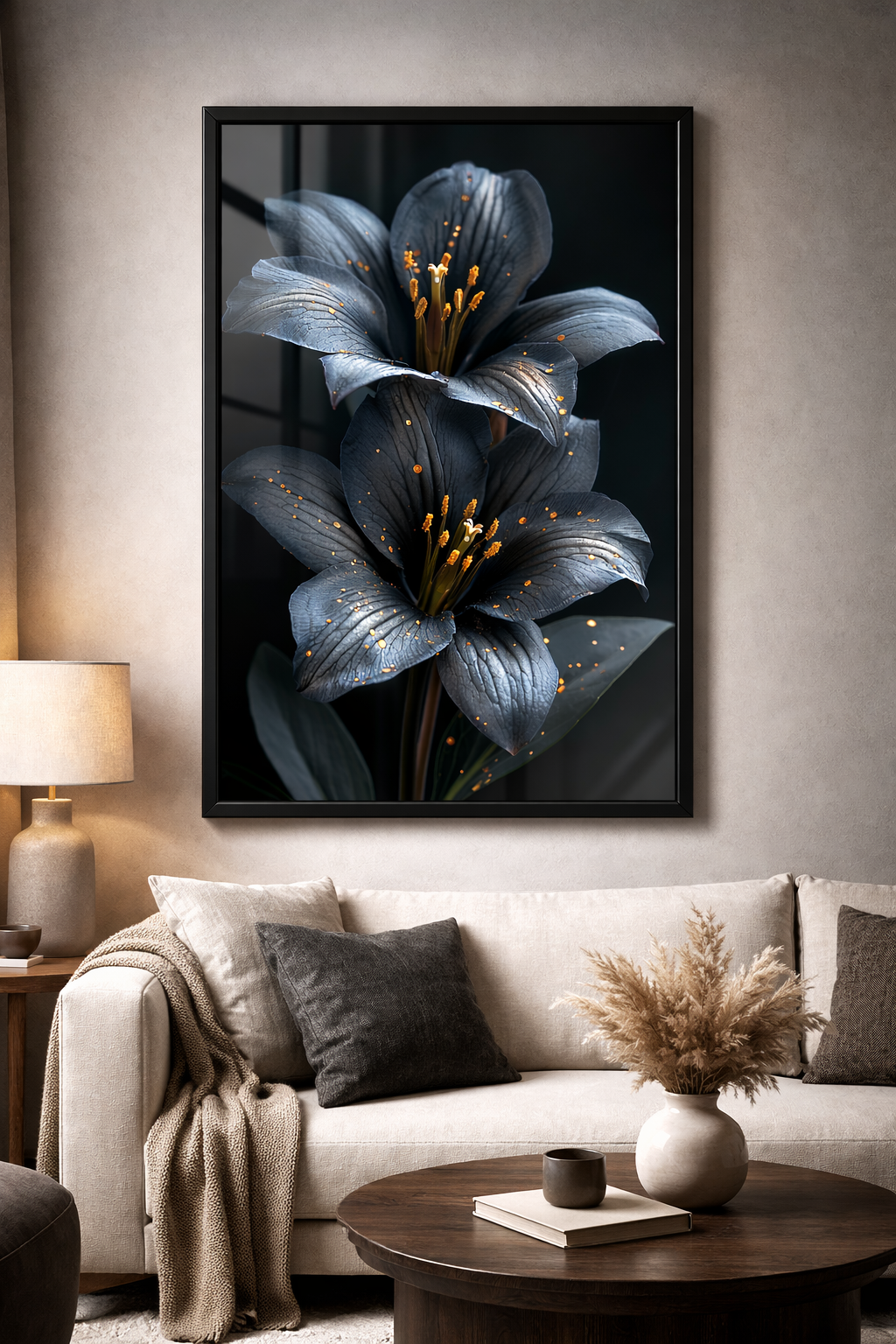 Este quadro decorativo floral apresenta uma composição elegante de flores em tons escuros com delicados detalhes dourados, criando um visual sofisticado, moderno e marcante. O contraste entre o fundo escuro e os pontos dourados realça a beleza das flores, trazendo profundidade e requinte à obra.